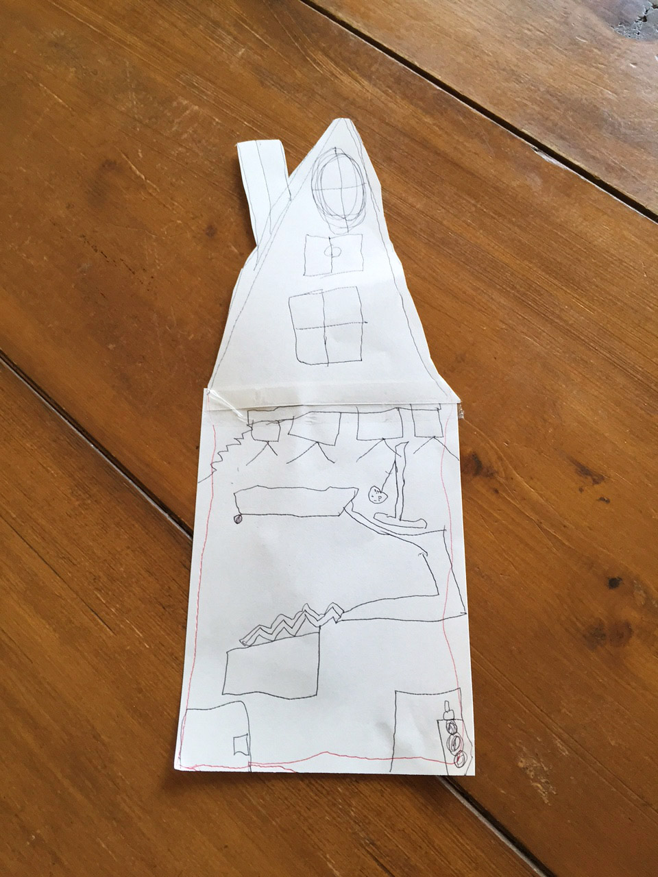 とんがった大屋根に煙突、階段や台所のレンジも表現されています。