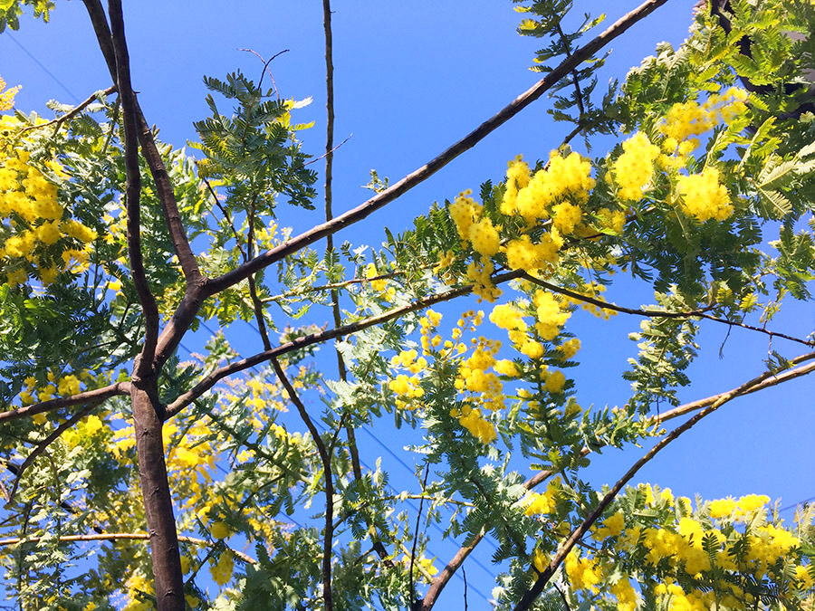 この季節になるとミモザ(mimosa)が華やかな黄色に染まります。