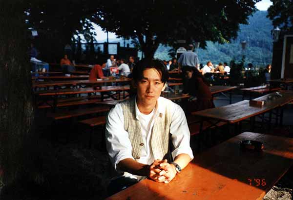 1996年、ドイツ在住時代の若い頃の僕(笑) 屋外のクナイペ(Kneipe)にて。