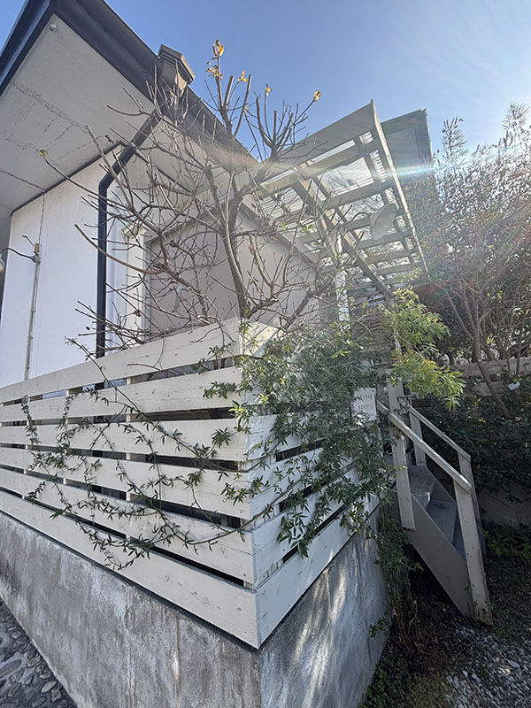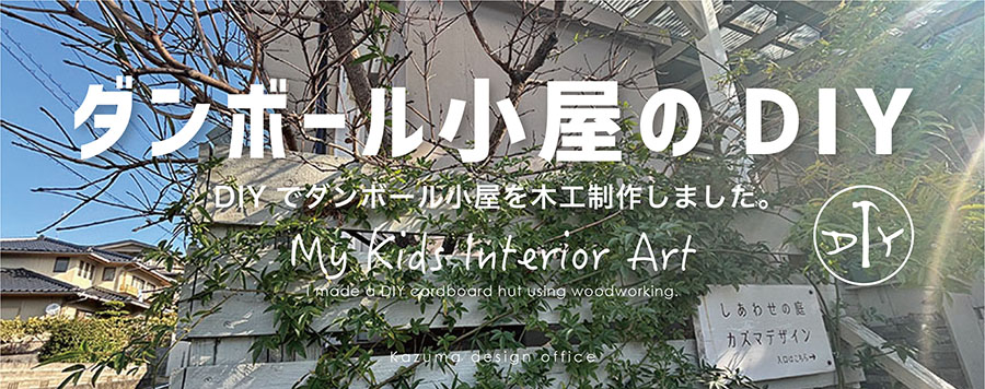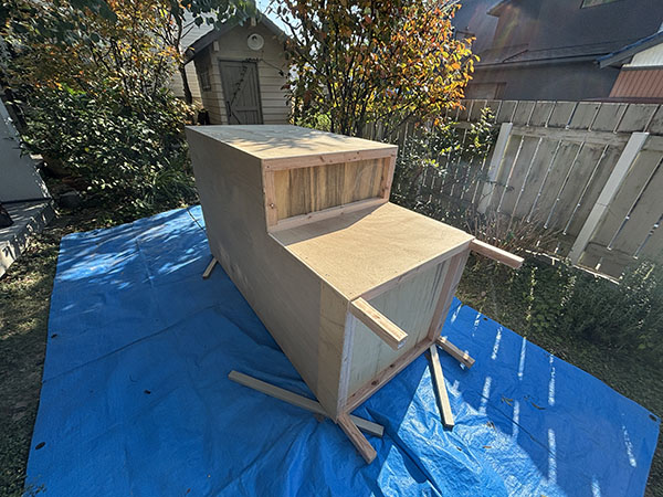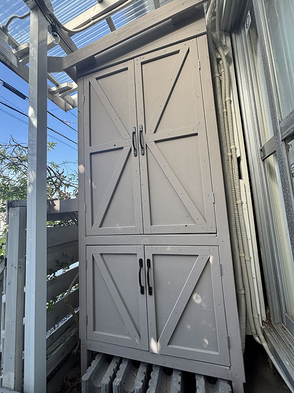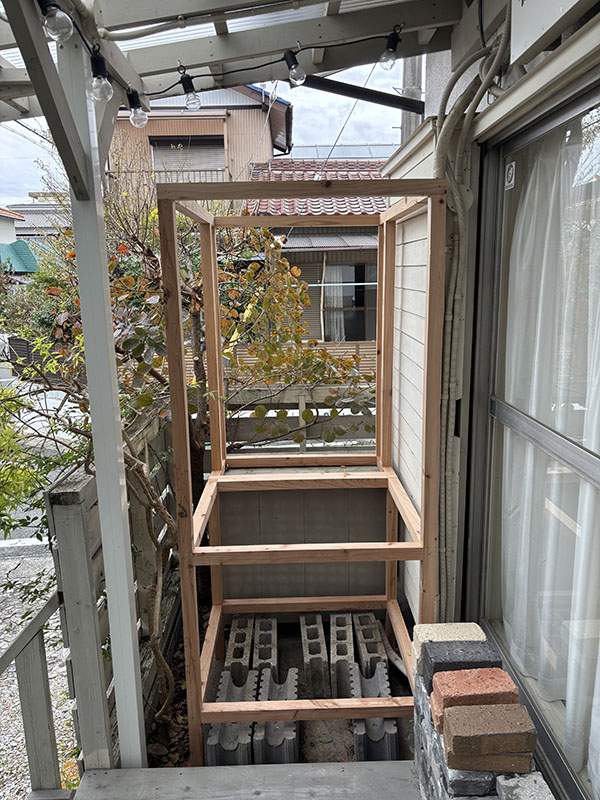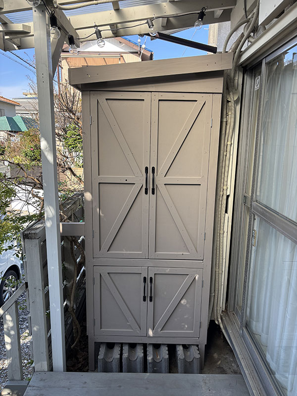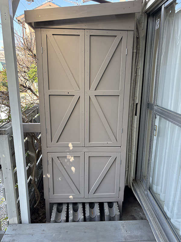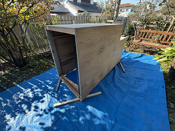 事務所の外に、ダンボールの収納スペースを木工制作で作りました。