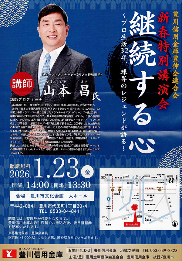 豊川信用金庫さん主催の山本昌 氏「新春特別講演会」を、豊川市文化会館へ聴きに行ってきました。