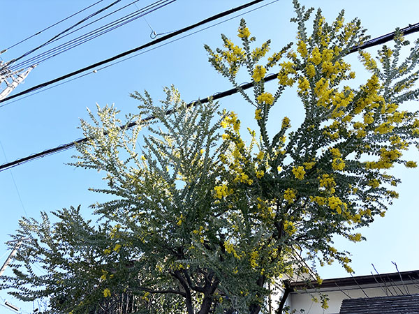 ふと庭を見ると、ミモザの木に明るい黄色の花が咲き始めていました。