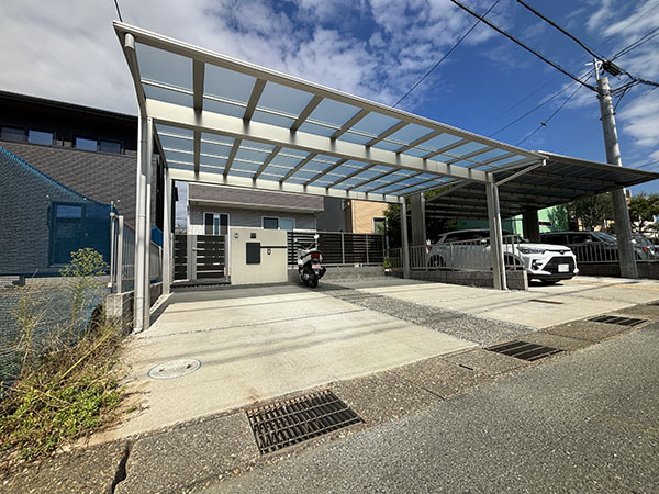 豊橋市のS様邸にてリフォーム外構工事、順調に進行しています♪ サイクルポートを設置施工しました。 材質はアルミ製で木目調のラッピングが施されており、ナチュラル感を演出しています。 立水栓&パンを設置しました。 擬似木(コ