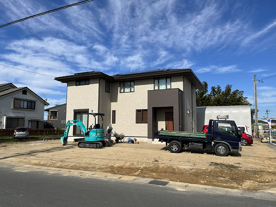 豊橋市のH様邸の新築外構工事が完了いたしました。 ビフォー→アフターをご紹介させて頂きます。 施工前の状態です。 外構工事がスタートしました。 まずは表土のスキトリ作業からです。 隣地境界ブロックのためのベ