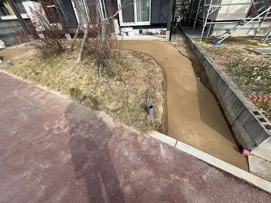 今日から豊川市T様邸のマサ土舗装工事がスタートしました。 マサ土舗装とは、マサ土とコンクリートをミックスした製品です。 特徴としましては、コンクリートほど強度はありませんが、安価でぬくもり感があります。 雑